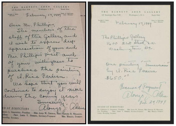 Letter from Alonzo Aden to Duncan Phillips about Irene Rice Pereira painting and purchase receipt