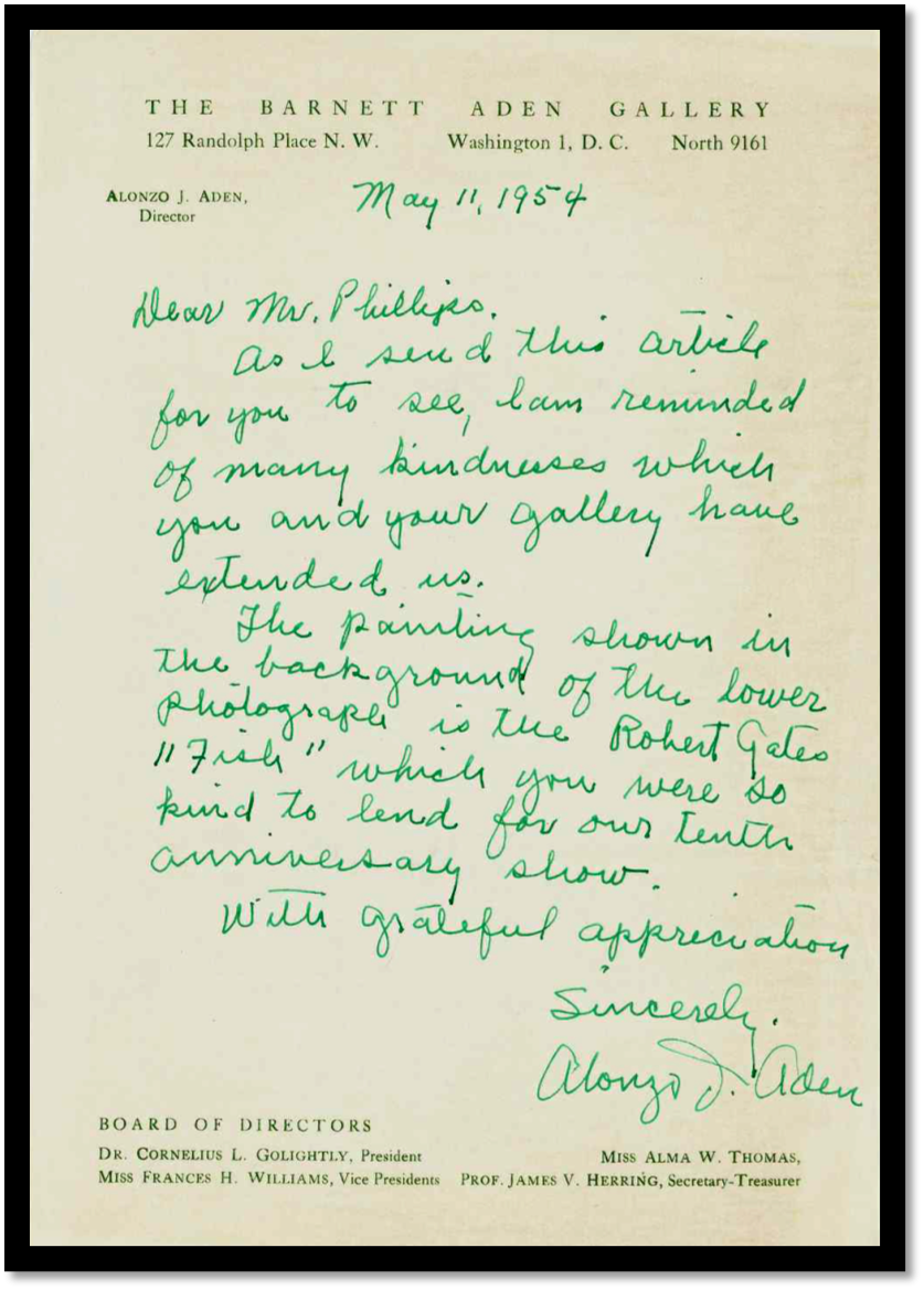 [Transcript: Dear Mr. Phillips, As I send this article for you to see, I am reminded of many kindnesses which you and your gallery have extended us. The painting shown in the background of the lower photographs is the Robert Gates "Fish" which you were so kind to lend for our tenth anniversary show. With grateful appreciation. Sincerely, Alonzo J. Aden]