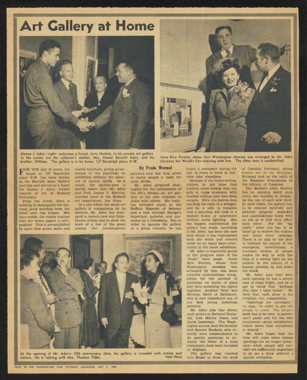 On May 2, 1954, Aden wrote a letter of thanks to Phillips and enclosed a newspaper clipping from The Washington Star, which relayed details from the 10th anniversary exhibition opening. Aden noted that The Phillips Collection’s loan was prominently featured in one of the images in the article.