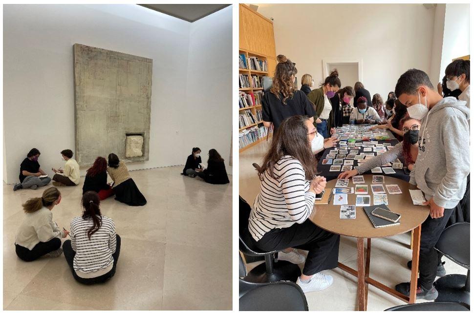 Left: University students exploring connections to Lawrence Carrollâs abstract artworks, Museo Madre, Naples; Right: University students and Daedalus members engaging with Phillips Art Cards, Museo Madre, Naples