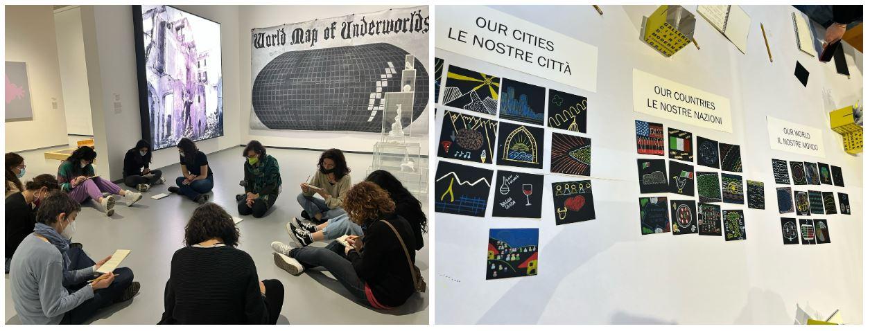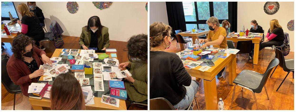 Left: Local Turin museum staff join for this workshop exploring confronting biases in our artwork choices; Right: Artist Marcos Lutyens (orange shirt) joins in on the workshop