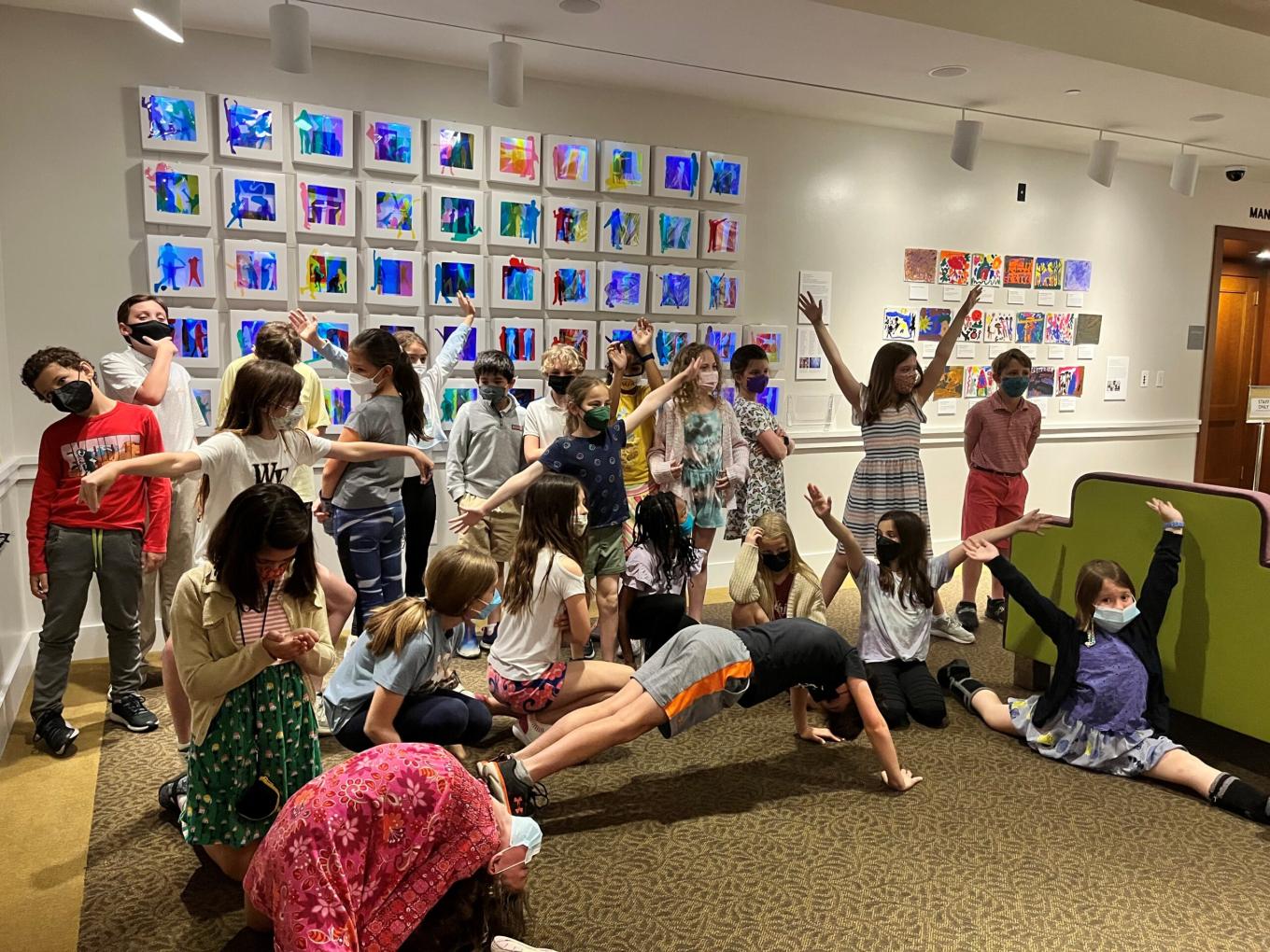 Grade 4 students from The Langley School pose like the gestures they made for their lightbox artworks