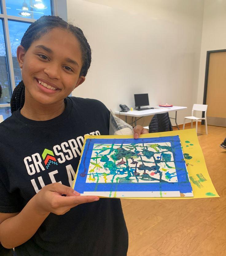 We experimented with liquid watercolor on wet paper, letting the paint flow in interesting paths as well as guiding it intentionally. We added a touch of coarse salt to the pools of color, surprised and delighted by the starbursts that suddenly appeared. To correspond with Gilliam’s improvisation, persistence, and intentionality, we practiced the Tree Pose. We swayed, finding flexibility, letting go of the idea of perfection, maybe falling, laughing, regaining balance, or starting over. On the final day, the girls reflected on their experiences in POW Yoga + Arts: “One thing I realized in this club is that whenever we do yoga, it really takes your stress away.” “I love how the instructors treated us, how loving and caring they are.” “This club helps me calm down my nerves and release stress. I feel like I’m pouring out how artistic I can be and how I really feel into my art.”