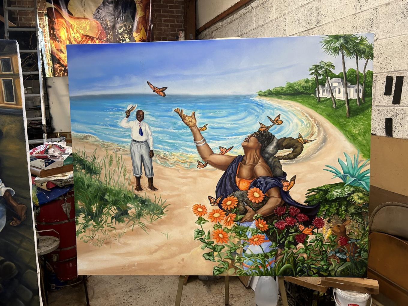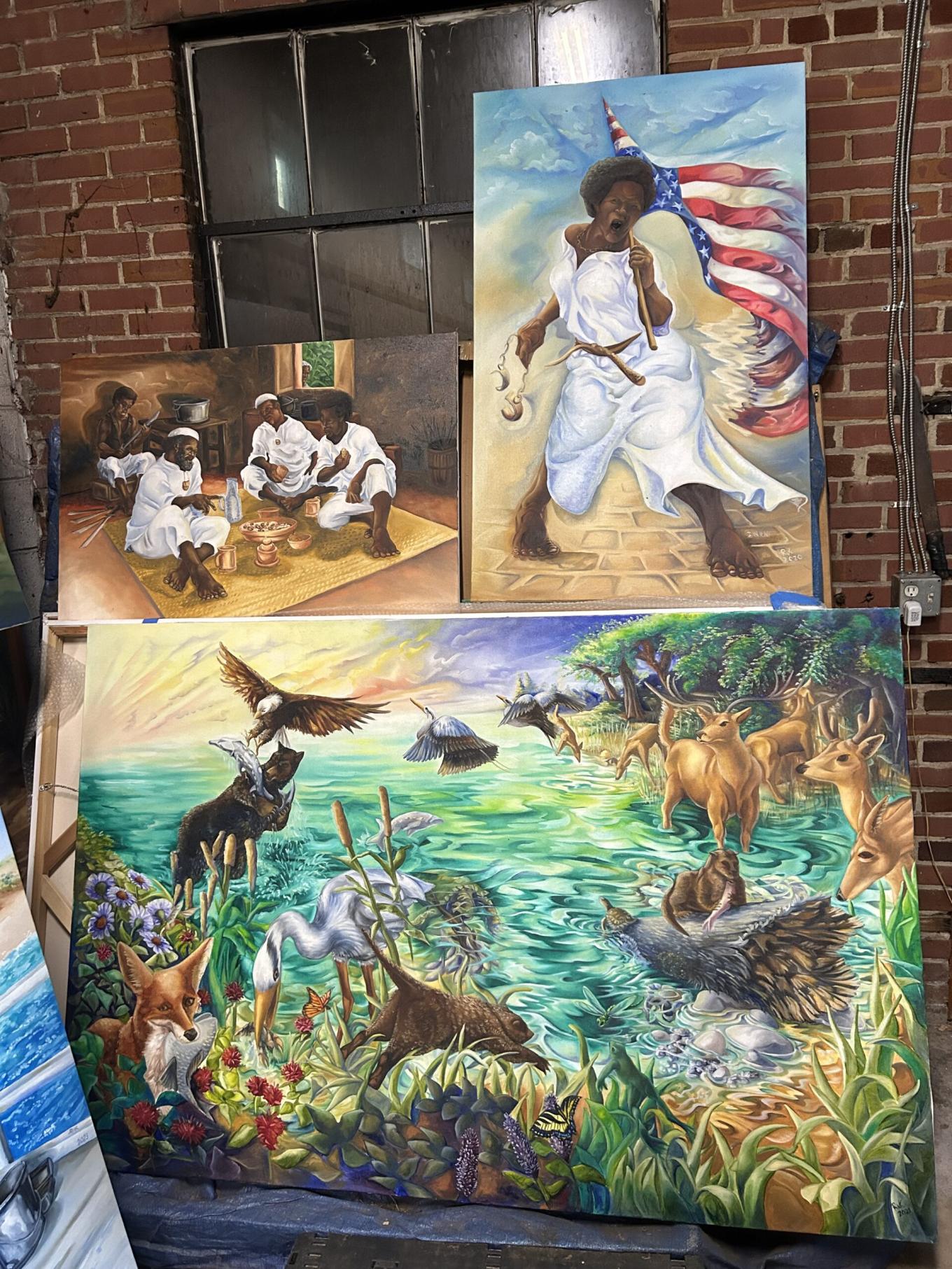 Freeman settled permanently in DC after purchasing his home in Deanwood, in Northeast, with his wife. From the outside, his house may seem homely and simple. However, the back tells a different story. Surrounded by beautifully manicured ponds and gardens lies Freeman’s home studio. The gorgeous brick building, covered in lively vines, bolsters large windows throughout, giving an abundance of natural light to the space. The studio harbors dozens of Freeman’s artworks throughout the decades, showing his progression not just as an art, but also as an individual. His beautiful studio often serves as a safe haven for his creative expression and a foundation for his artistic storytelling. Rather than focusing primarily on iconic Black figures, Freeman’s artistic storytelling has also taken a different path. He purposefully emphasizes the importance of ordinary people in the Black community, highlighting their role in developing and influencing leaders. Through his murals, Freeman hopes to highlight the vital role of everyday individuals in the rich fabric of Black history and culture. “A book, you can close it. But a painting, you have to see”